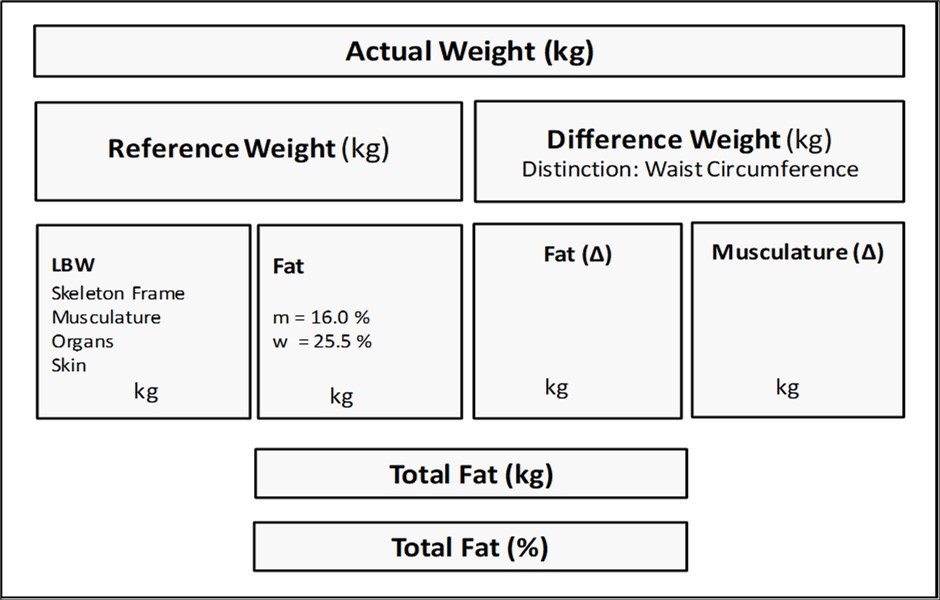 The limitation of the model at this stage of design was the inability to distinguish between muscularity and fat tissue. For that reason, the circumference of the waist (WC), a marker for central obesity, was integrated into the model. Processed by a network of algorithms, it enables the differentiation of the difference weight – that means the difference between the actual weight (ActWt) and the reference weight (RefWt) – into fat mass (FM, kg) and muscle mass (MM, kg). The implementation of waist circumference in the DBA model as a proxy for body fat resulted in a strong concordance with BIA measurements 7. The quantification of fat mass made it possible to determine the lean body mass (LBM), which is defined as a fat free corpse and is calculated by subtracting the fat-mass values from body weight. A schematic illustration of the DBA model is shown in Figure 1 (Figure 1).