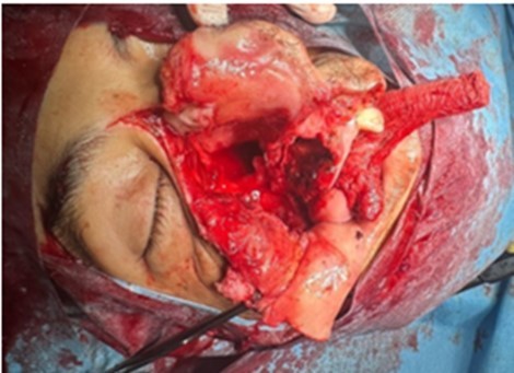 Patient aged 40 years without any surgical medical history who consults at our level in 2022 for a right epistaxis of average abundance with nasal obstruction and an induration next to the maxillary sinus right to palpation. Endoscopy revealed a reddish polypoid mass filling the right nasal cavity without palpable cervical adenopathies, CT returned in favor of an expansive tissue process of the right maxillary sinus, extended to the soft parts and the homolateral nasal cavity. The complete resection of the mass was performed by endonasal surgery (endoscopic maxilectomy). The histological examination found hemangioendothelioma without signs of malignancy with infiltrated margins, external complementary radiotherapy was indicated (50 Gy, 2Gy per day for 5 days a week on the maxillary sinus), a radiological check (MRI) 4 months later does not find any residual tumor. After an absence of 15 months, the patient revisits for resumption of symptomatology with right epistaxis of great abundance requiring 2 globular units, a reddish mass protruding from the nasal vestibule, lysing the bony palate with extension towards the cheek (Figure 1) and alteration of the CT and MRI find an expansive tumor process centered on the nasal cavity and maxillary sinus right of 103x 58 x41 vs 156x67x95mm with currently highly elevated spans, the process is globally hypodense and weakly elevated, presence of some vessels as well as hypervascular portions of peripheral localization at the extended jugal level and in front of the internal canthus, bone palace lysis, with a negative extension balance (Figure 2).